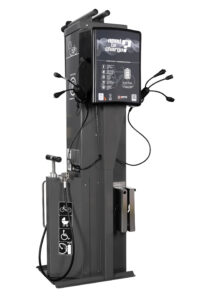 On the front of our stations there are the aforementioned tool cabinets, in which the accessories are attached to steel ropes braided with rubber covers. Thanks to this rubber protection, the lines do not get tangled with each other and do not pose a risk of scratching the frames of the serviced vehicles. In addition, they also have an appropriately selected length, thanks to which they allow you to reach all vehicle components that require special attention. E-bike repair stations are also equipped with manual pumps with adapters that are suitable for all bicycle valves. The bike itself, on the other hand, can be placed on a special grip which enables an ideal position for carrying out various repairs.