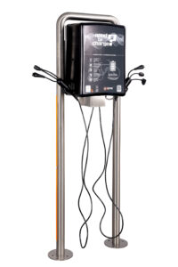 The robustness of our e-bike repair stations is just one of their two main advantages. The second, no less important, is optimized usability and safety. Our devices combine the features of fixing and charging stations, in which their front is dedicated to repairs, while the back is used for charging. Thanks to omega, a cover panel placed on the back of the station made of steel and secured with anti-theft screws, we protect the electric cable against manipulation from the outside. Our module also has security features in accordance with European Union directives regarding the provision of electrical sockets in public spaces.