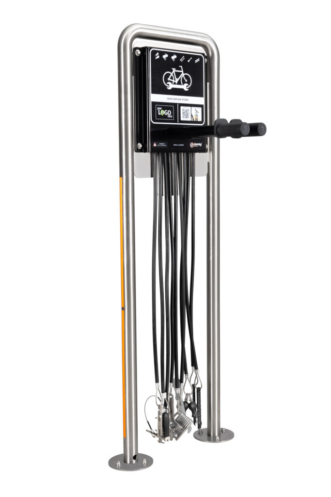 Bike Repair Point – IBOMBO HOKO is suitable for public spaces. It is designed for both: indoor and outdoor use and dedicated for small spaces. It is made of galvanized steel with powder or thermoplastic coating. The device is designed for wall mounting.
