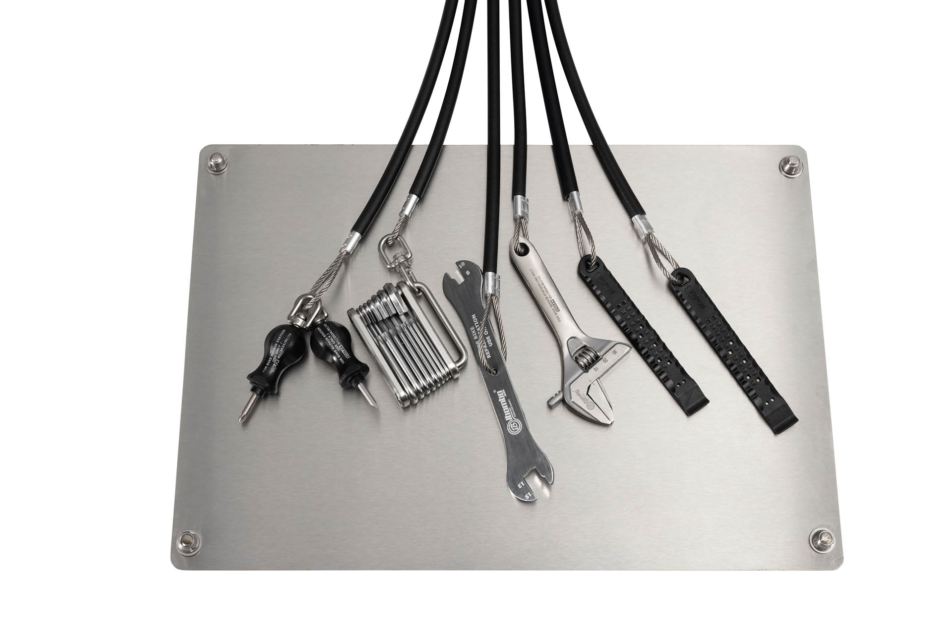 The tools are attached to the stainless steel ropes hanging from the device; the length of the ropes allows you to reach all bicycle components. The rubber coating of the ropes prevents tools from tangling and protects the bicycle frame from scratching. Wall bumper plate made of brushed INOX stainless steel (AISI 304) protects the wall against dirt and damage.