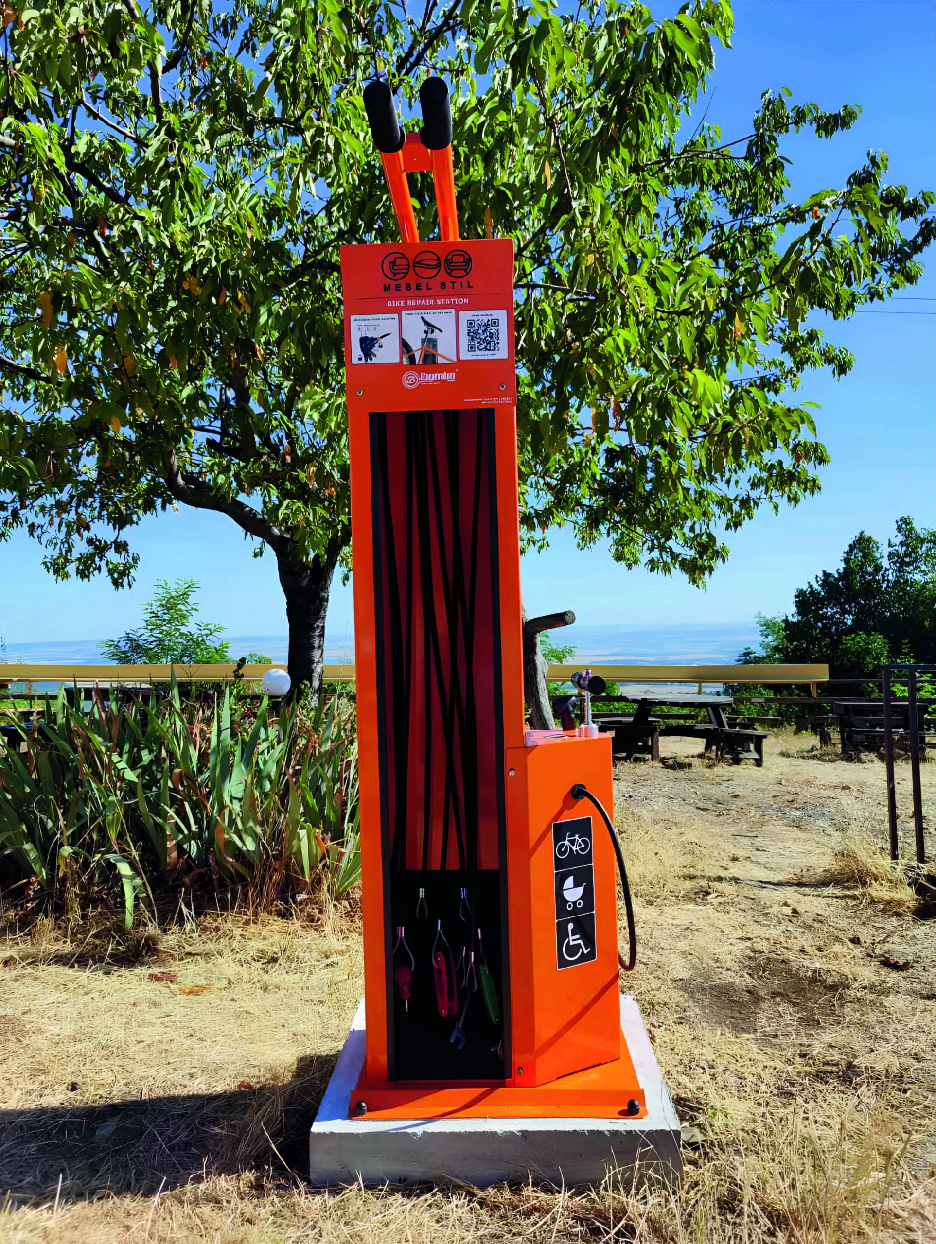The QR CODE placed on the front of the station allows you to use online publications containing instructions on repairing bicycle faults. Sheet metal elements of the device are fastened with anti-theft screws – the bits for these screws will be handed over to the customer. This model of the station can be additionally equipped with, among others, aluminium waterproof frames, side-or-back bike stand, a pneumatic skateboard holder or E-BIKE bicycle charging module.