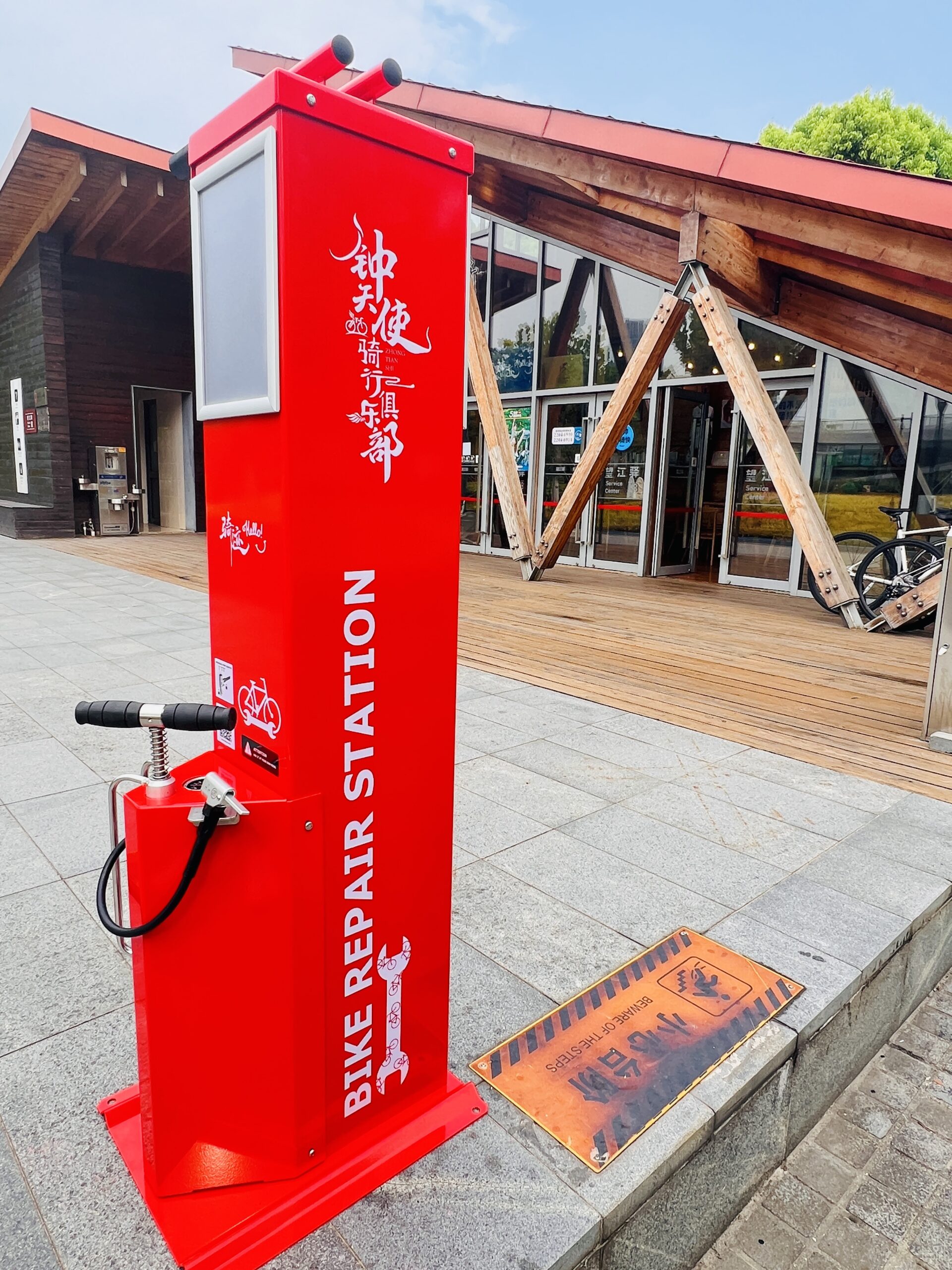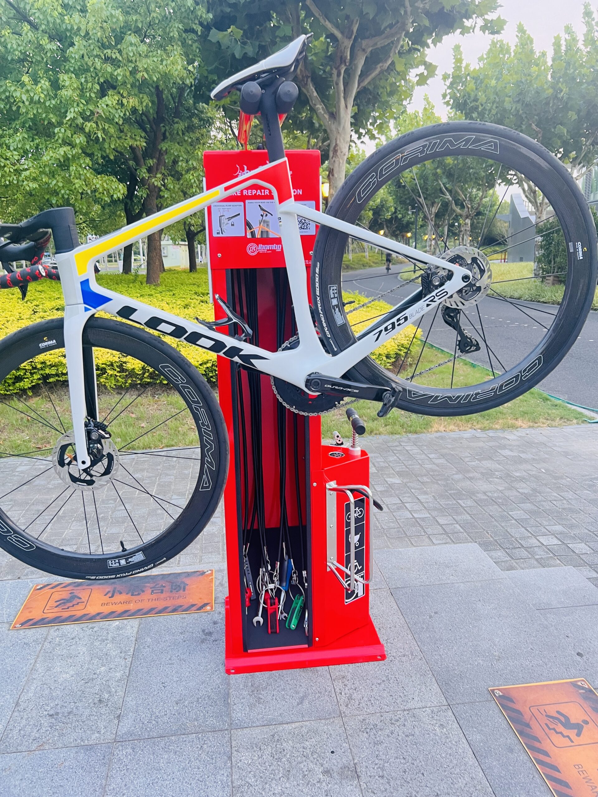 The tools are attached to the stainless steel ropes hanging inside the column of the station; the length of the ropes allows you to reach all bicycle components. The rubber coating of the ropes prevents tools from tangling and protects the bicycle frame from scratching. The construction of the station allows you to place the bicycle on the grip, so you can easily turn the crank while repairing the bike. The station is equipped in a hand pump with an adapter for all valve types.