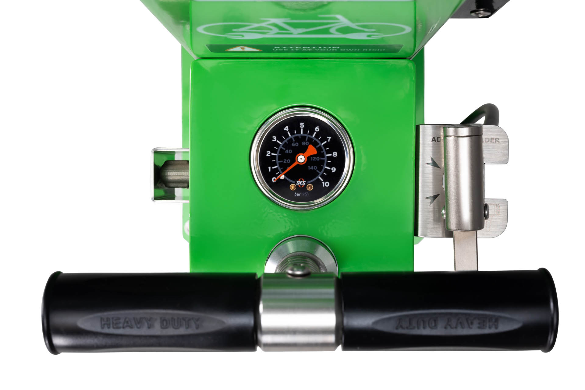 The tools are attached to the stainless steel ropes hanging inside the column of the station; the length of the ropes allows you to reach all bicycle components. The rubber coating of the ropes prevents tools from tangling and protects the bicycle frame from scratching. The station is equipped in a hand pump with an adapter for all valve types. The construction of the station allows you to place the bicycle on the grip, so you can easily turn the crank while repairing the bike.