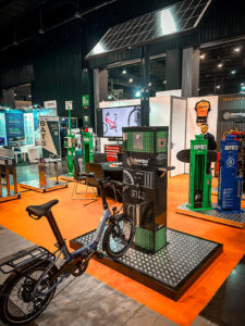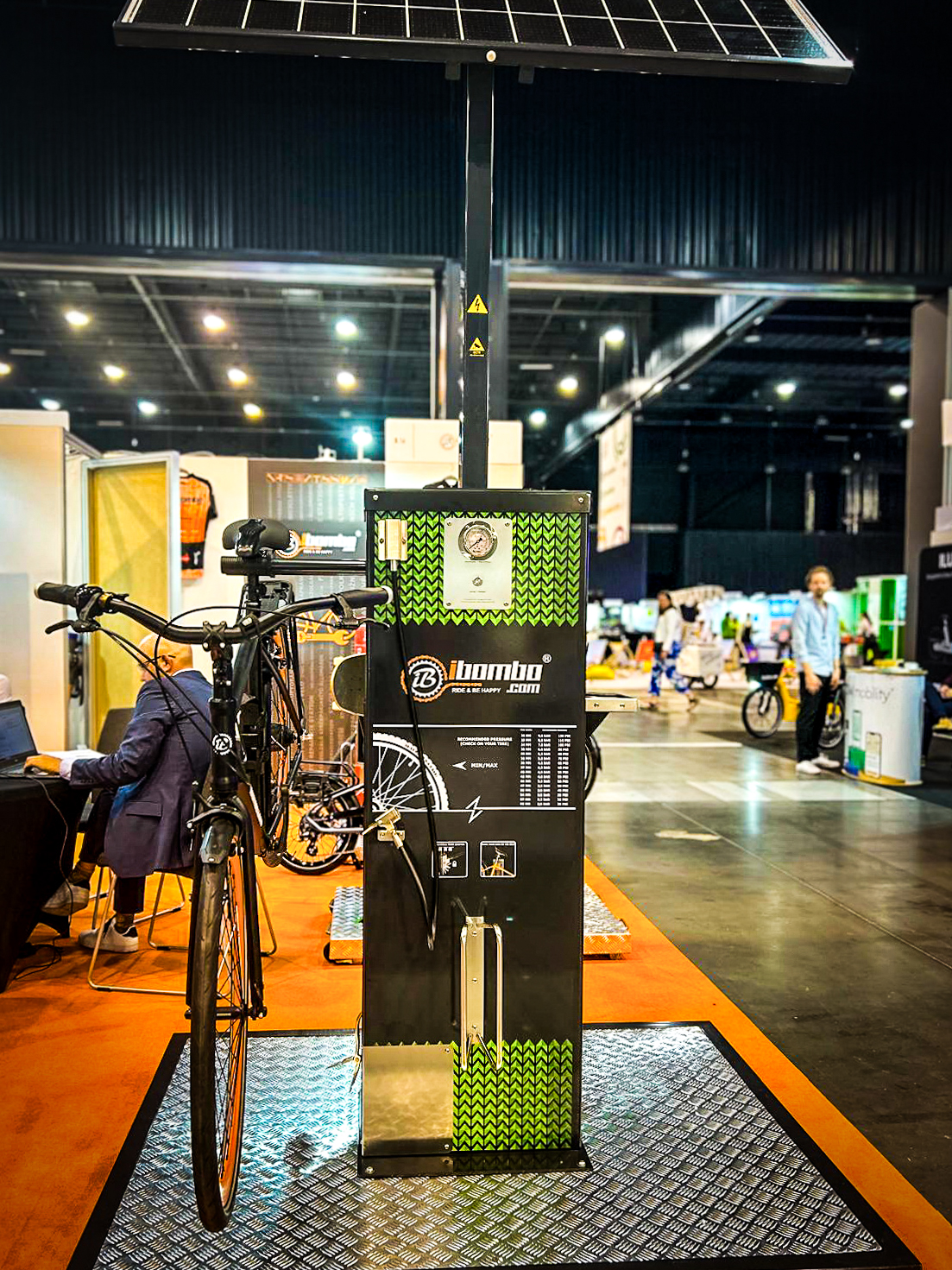 The station features an electric compressor (up to 10 bar) with an IBOMBO AISIPRO 630 HEAD™ adapter (AISI 630 stainless steel, nickel-plated), compatible with Presta/Schrader/Dunlop valves. The adapter is mounted on a reinforced industrial-grade hydraulic hose, making the system exceptionally durable and difficult to cut.